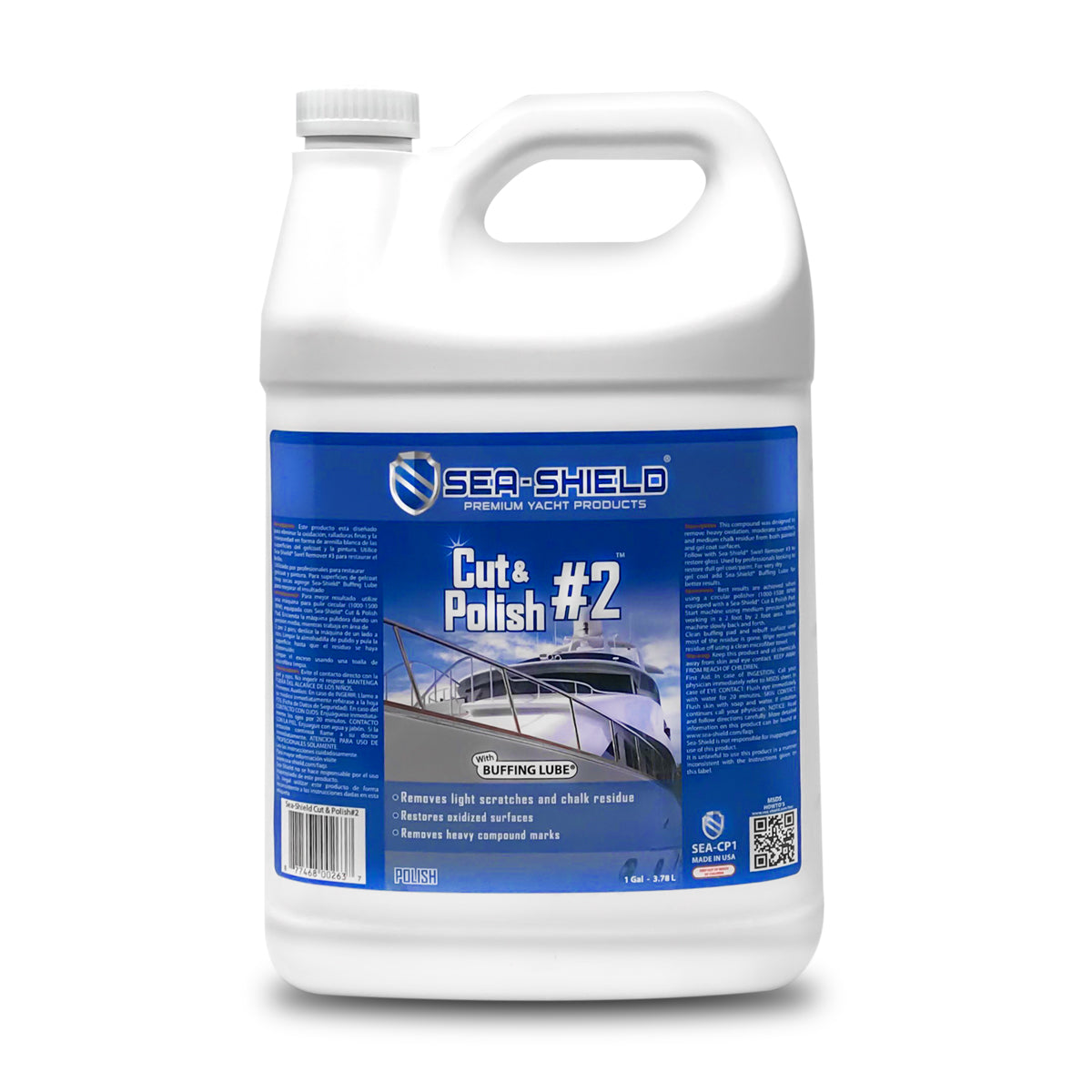 Next, use Sea-Shield Cut and Polish #2. This product removes 1500 grit sandpaper haze, light scratches, light oxidation, and chalk from both paint and gel coat. It also removes heavy compound marks left from the first step. The formula is very lubricated, which prevents burning the surface. Apply using a circular polisher (1200-1800 RPM) with a compound wool buffing pad #2.