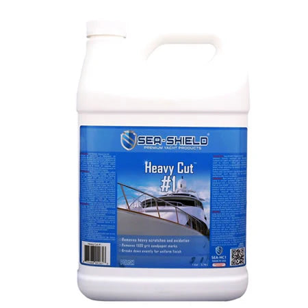 For heavy oxidation and scratches, start with Sea-Shield Heavy Cut #1. This compound removes heavy oxidation, moderate scratches, heavy chalk residues, and even 1000-grit sandpaper marks from both painted and gel coat surfaces. Best results are achieved using a circular polisher (1200-1800 RPM) equipped with a compound wool buffing pad #1. Work in areas no larger than 3'x5', moving the machine slowly back and forth while keeping the pad flat on the surface.